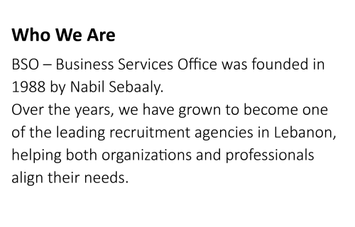 As a leading recruitment agency, we are perfectly equipped to assist you in finding the suitable employees for your organization, whether you are looking for permanent, temporary, or contract-based staff. Our team of specialist consultants understands the importance of market and industry knowledge and dedicates the time and energy to learn exactly how our clients operate and understand their needs and ensure that we deliver the highest level of customer service. BSO was founded by Nabil Sebaaly more than 30 years ago, and since then, we pride ourselves on our reputation for delivering excellent services and working closely with our clients and candidates to offer professional recruitment services.